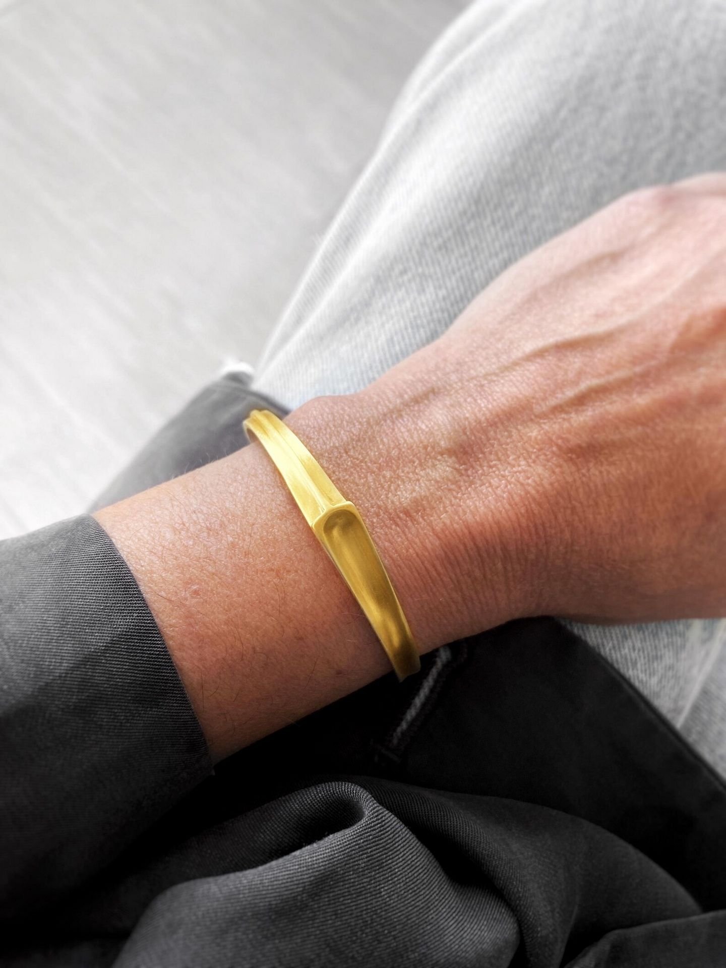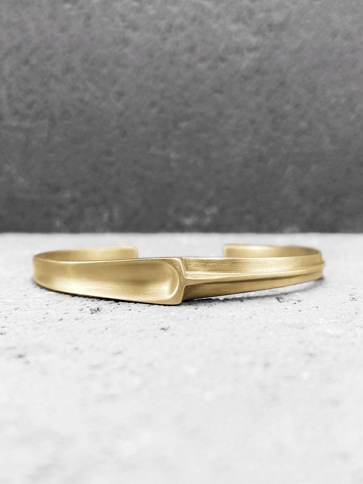 The aesthetics of this modern cuff bracelet are striking and distinct, as the sculpted surfaces create a captivating visual impact. The edginess of its assymetrical design adds a touch of attitude and character, while the use of sterling silver reflects a subtle luxury. A versatile chunky accessory complementing a wide range of personal styles and outfits, while its form allows for a comfortable fit and easy adjustment, making it suitable for various wrist sizes.