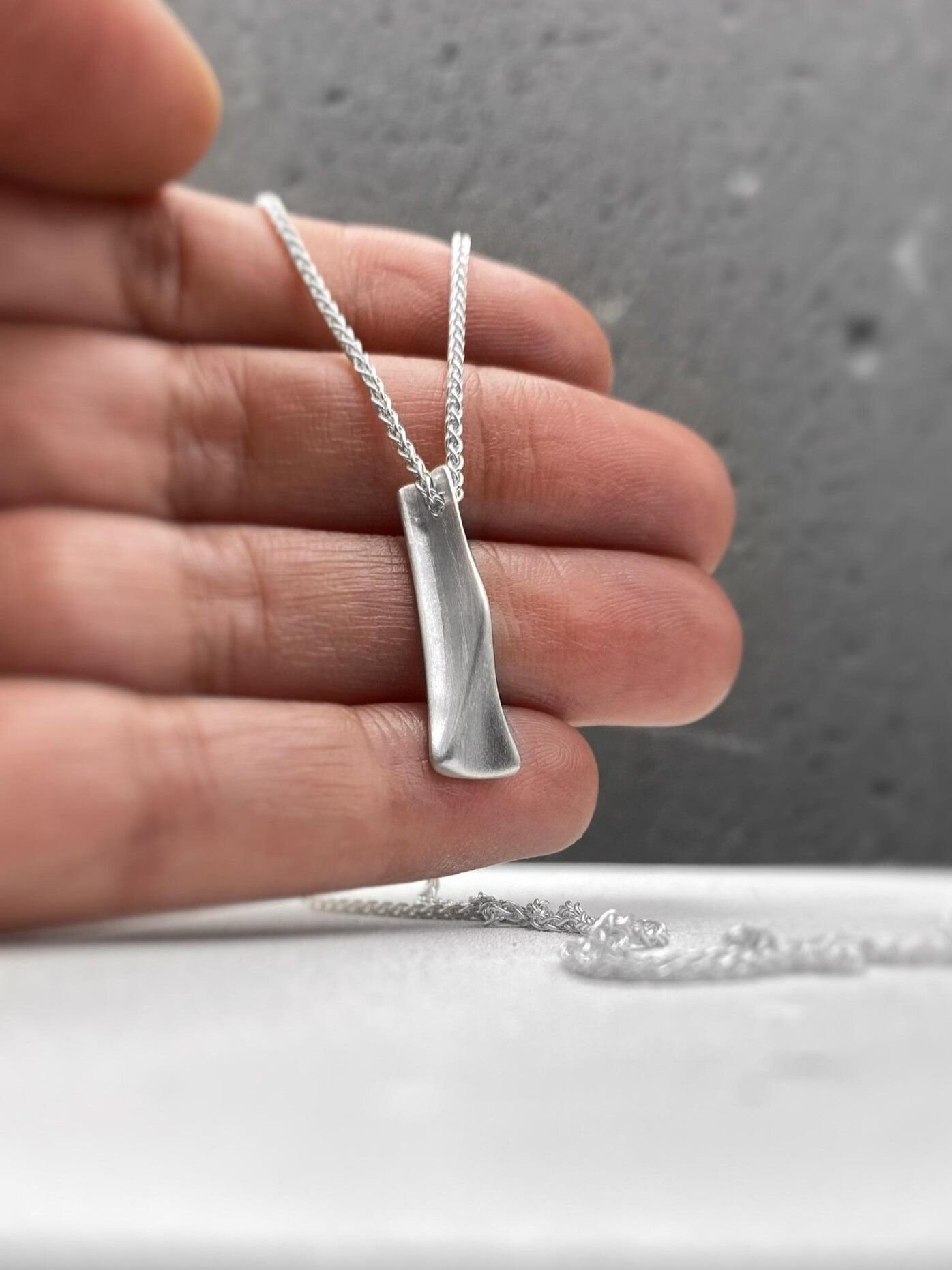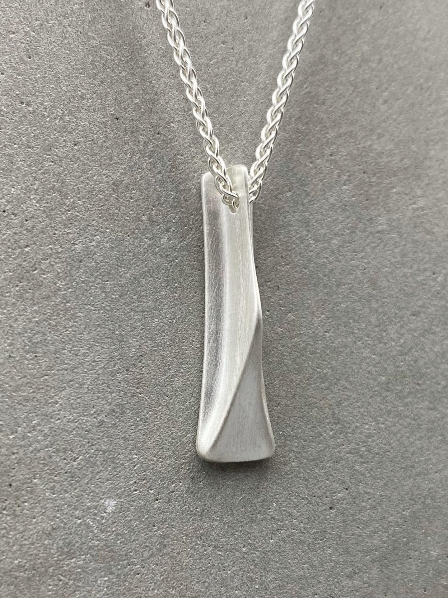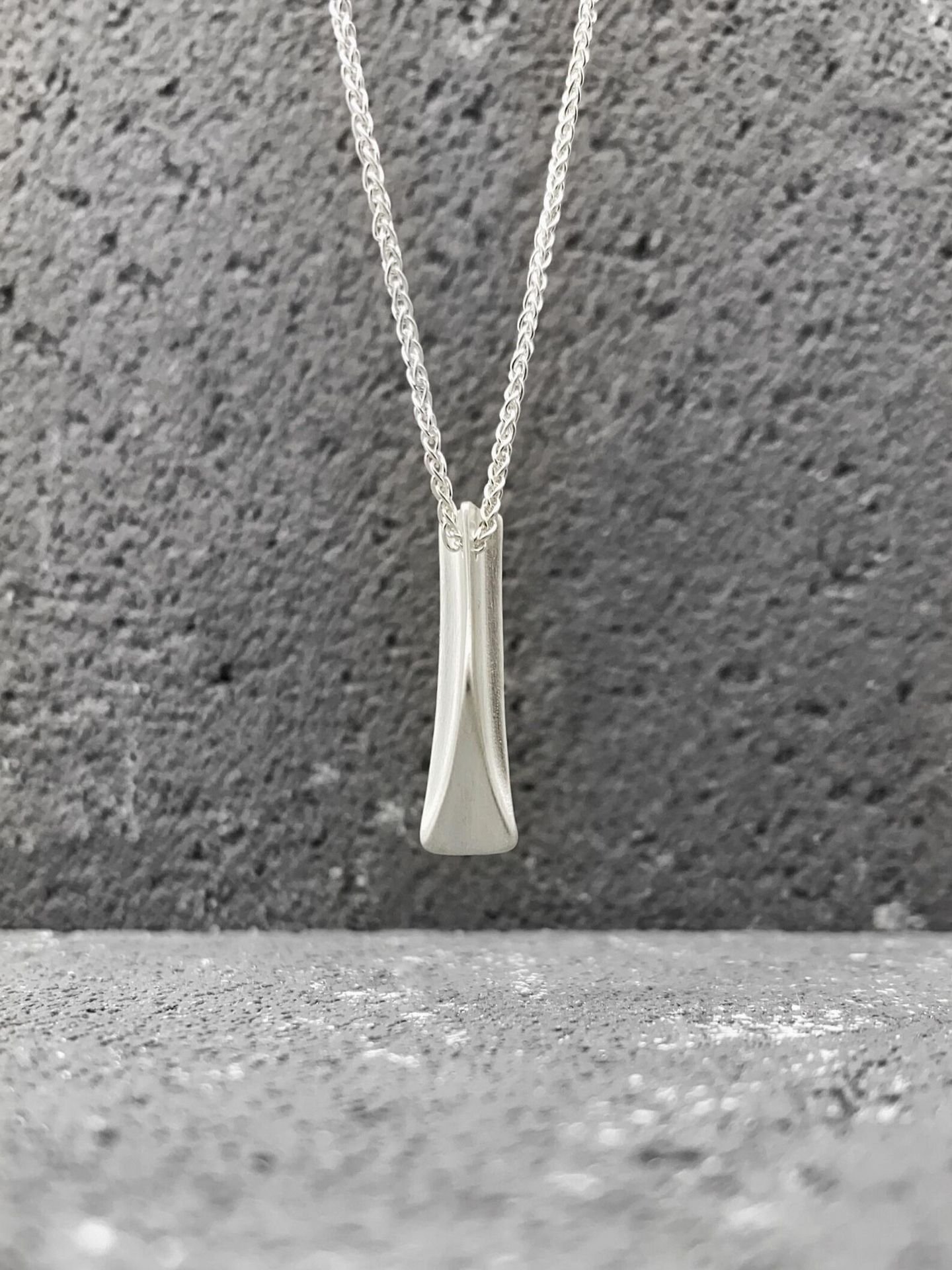 The aesthetics of this modern sterling silver pendant necklace are striking and distinct, as the sculpted surfaces create a captivating visual impact. The edginess of its assymetrical design adds a touch of attitude and character, while the use of sterling silver reflects a subtle luxury. A versatile chunky accessory complementing a wide range of personal styles and outfits.