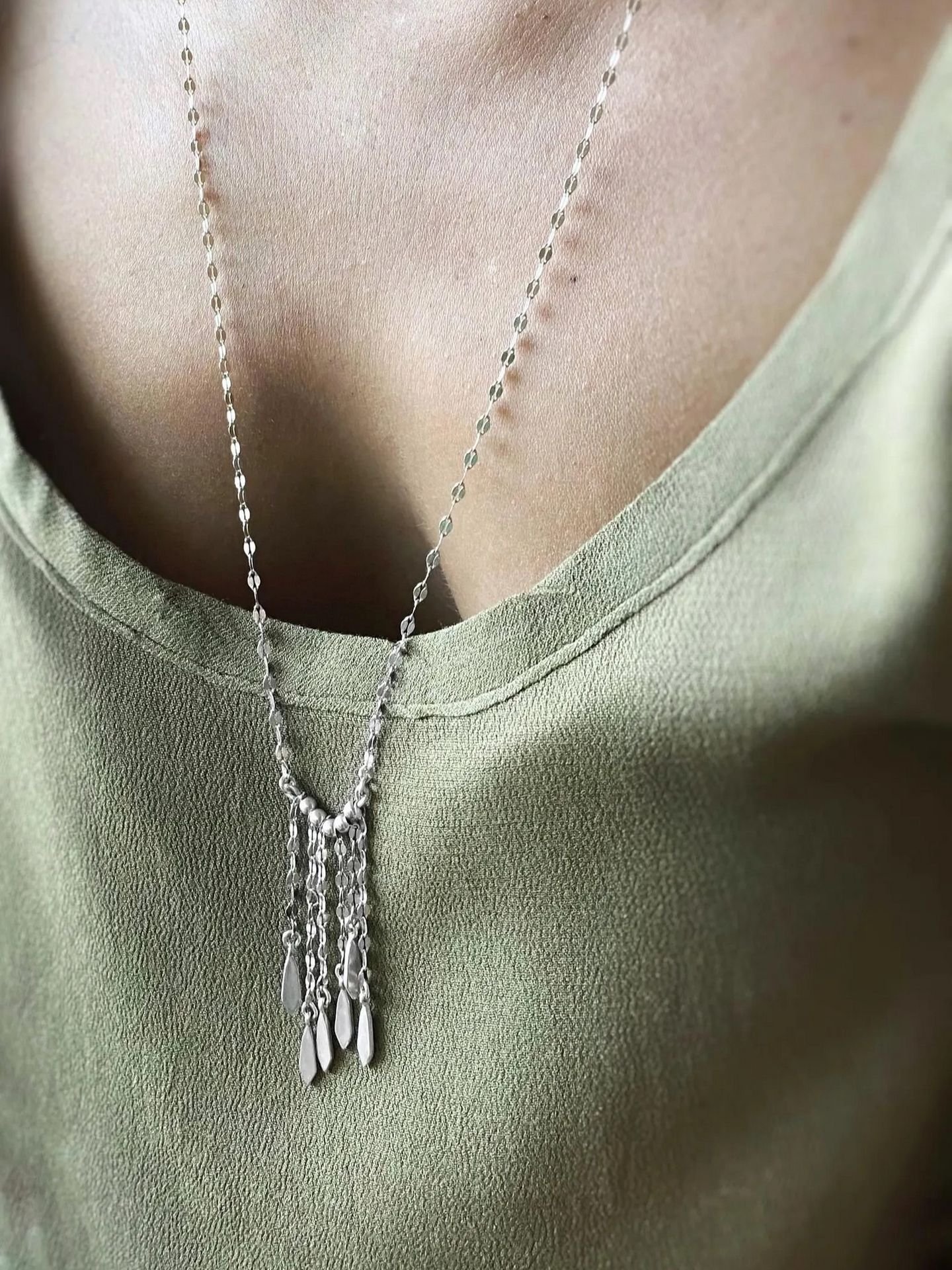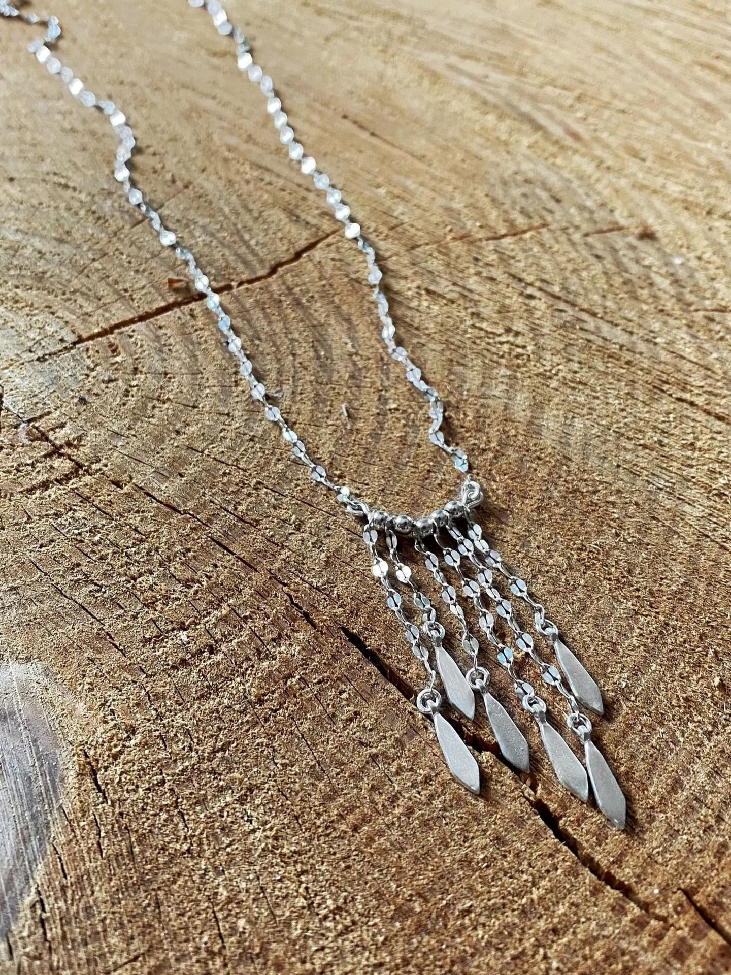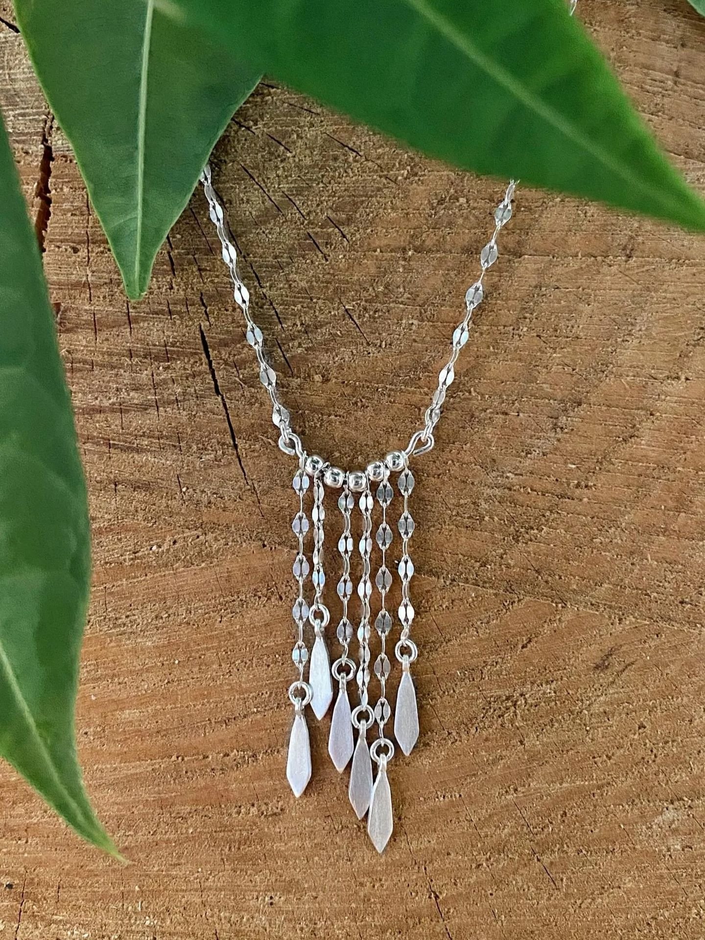 A stunning sterling silver necklace, featuring a delicate yet eye-catching fringe of silver dangle charms. This piece blends bohemian elegance with a minimalist edge.
